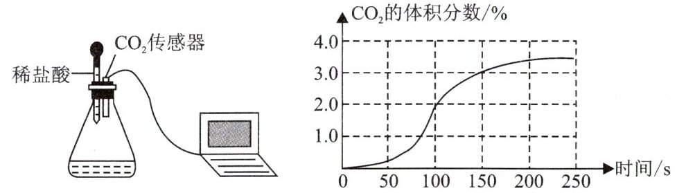 5. 为测定某氢氧化钠固体是否变质,兴趣小组同学取一定量的样品配制成溶液,加入锥形瓶中,再逐滴加入稀盐酸至过量,并利用传感器测定$CO_2$的含量,如图所示,下列说法不正确的是(