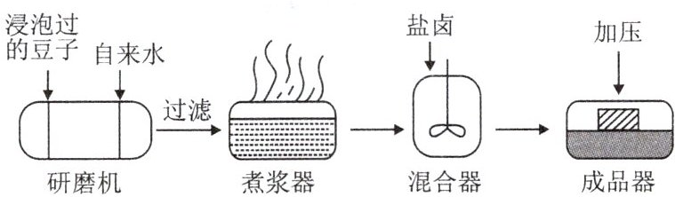 11. 制作豆腐的过程中用到了盐卤。盐卤是我国数千年来制作豆腐的传统凝固剂,有较好的溶解性和凝固性,主要成分为氯化钠(含量约$2\%∼6\%$)和氯化钾(含量约$2\%∼4\%$)等。豆腐的制作流程如下,结合图文信息,分析思考,解决问题。