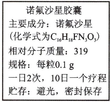 (1)如图是诺氟沙星胶囊的说明书,服用诺氟沙星胶囊(化学式为$\mathrm{C_{16}H_{18}FN_3O_3}$)可以治疗肺炎,从组成上可知诺氟沙星属于