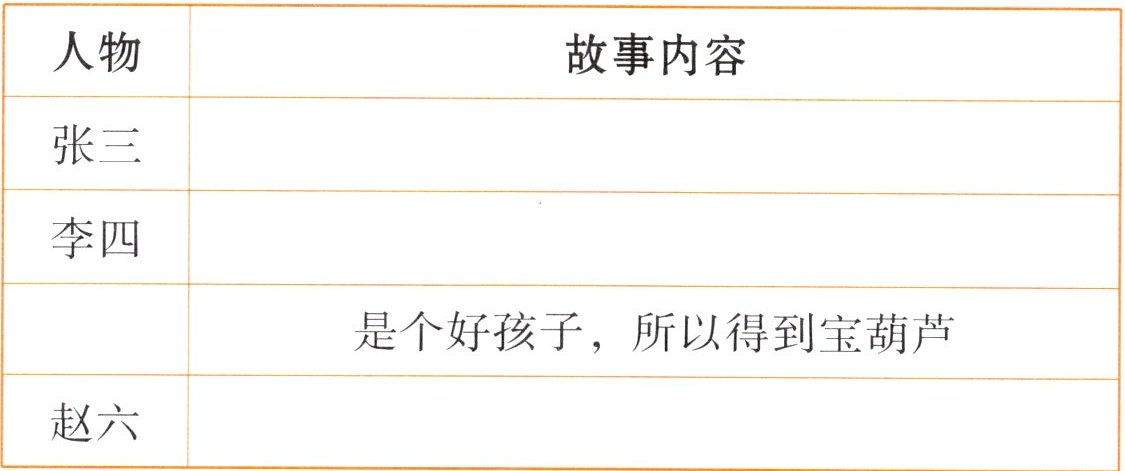 2. 选段中奶奶给王葆讲了个得到宝葫芦的故事。根据故事内容,把下面的表格补充完整。