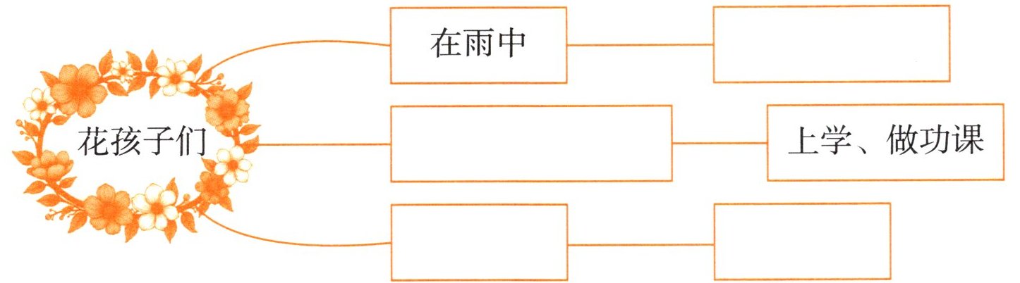 树枝在林中互相碰触着,绿叶在狂风里簌簌地响,雷云拍着大手。$\underline{这时,花孩子们便穿了紫的、黄的、白的衣裳,冲了出来。}$