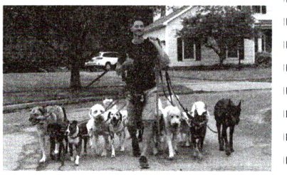 People pay Kent to take their dogs for a walk. He picks up five dogs from their homes and takes them to the park to exercise. One hour later, he takes each dog home and then picks up another five dogs. He takes fifteen dogs for a walk every day. Kent says: "It's hard, but I love dogs. And I take good care of them."
