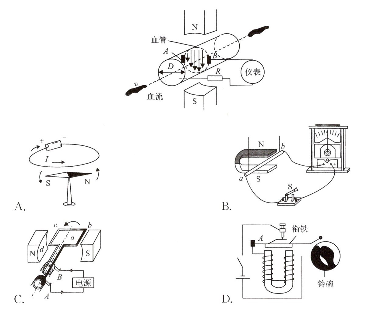 5. 如图,电磁血流计是利用电磁感应原理制成的,用来检测血流速度和血流量的仪器。下列选项所反映的原理与之相同的是(