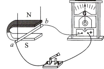 有关。(3)闭合开关后,当导体$ab$向左运动时,电流计指针向右偏转。现将蹄形磁体$S$、$N$极对调,并使导体$ab$向左运动,此时电流计指针向