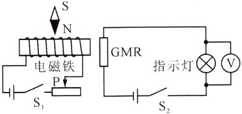 10. 如图,$ GMR$是一个巨磁电阻,其阻值随磁场的增强而急剧减小,当闭合开关$ S_1$、$ S_2$时,下列说法正确的是(