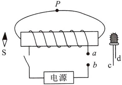 11. 如图,将某发光二极管的两极接入电路的$a$、$b$两点,闭合开关时,通电螺线管旁边小磁针$S$极向右偏转。下列判断正确的是(