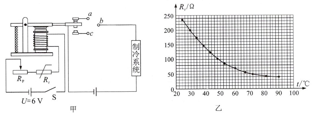 15. 纯电动汽车是采用蓄电池作为唯一动力源的汽车,电池的安全性主要体现在对其温度的控制上,当某组电池温度过高时,制冷系统会立即启动进行降温。小明设计的模拟控温装置如图甲所示,电磁继电器与热敏电阻$R_t$、滑动变阻器$R_P$串联接在电压为$6\ V$的电源两端。当电磁铁线圈(电阻不计)中的电流$I$大于或等于$25\ mA$时,衔铁被吸合。热敏电阻置于温度监测区域,其阻值$R_t$与温度$t$的关系如图乙所示,滑动变阻器的最大阻值为$200\ \Omega$。
