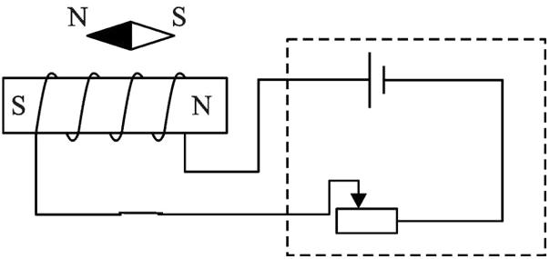 14. 将下图中的电磁铁连入所设计的电路中,电路画在虚线框内,要求: