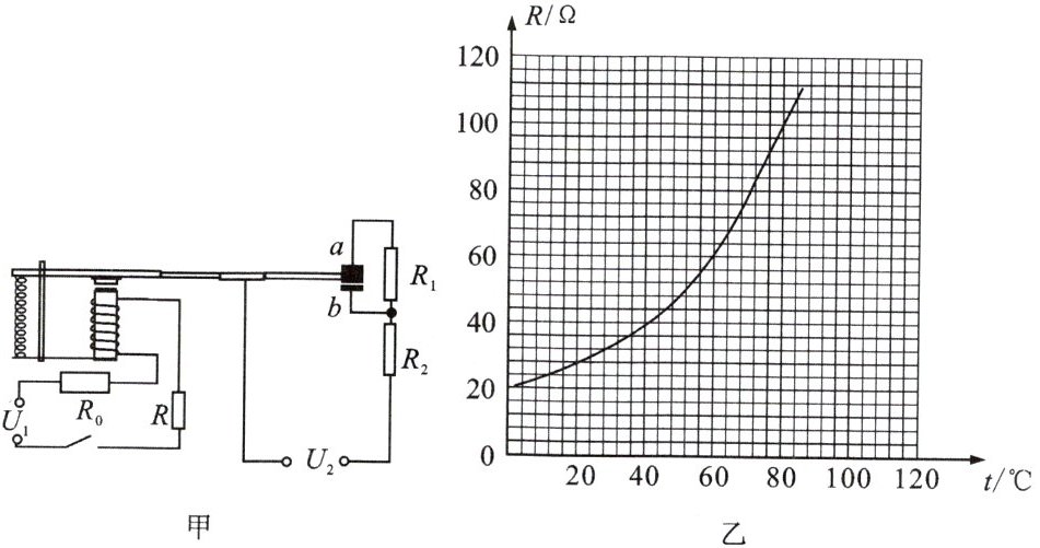 17. 为实现自动控制,小明同学利用电磁继电器(电磁铁线圈电阻不计)制作了具有延时加热、保温、消毒等功能的恒温调奶器,其电路如图甲所示。控制电路中,电压$U_1 = 3\ V$,定值电阻$R_0 = 50\ \Omega$,热敏电阻$R$阻值随温度变化的图像如图乙所示;工作电路中,电压$U_2 = 220\ V$,$R_1 = 836\ \Omega$,$R_2 = 44\ \Omega$。已知恒温调奶器容量为$2\ L$,水温达到$80\ \celsius$时衔铁会跳起。[水的比热容为$4.2 × 10^3\ J/( kg · \celsius)$]