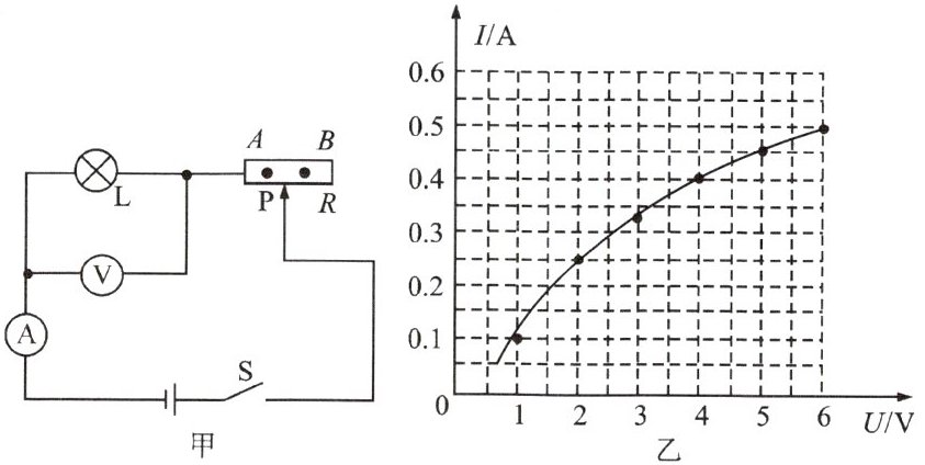 12. 图甲是调光台灯的模拟电路,电源电压不变,小灯泡规格是“$6\ V \ \ 3\ W$”,闭合开关 S,当滑动变阻器的滑片 P 在 A 点时,滑动变阻器连入电路的电阻为$R_1$,电压表的示数为$4\ V$;当滑动变阻器的滑片 P 在 B 点时,滑动变阻器连入电路的电阻为$R_2$,电压表的示数为$2\ V$,且$R_2 = 2R_1$,小灯泡的$I-U$图像如图乙所示,则下列说法不正确的是(