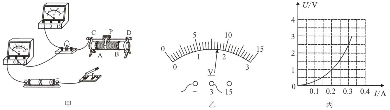 (选填“电压表”“电流表”或“小灯泡”),直至小灯泡正常发光。(3)通过移动滑动变阻器的滑片 P,进行多次测量记录数据,并绘制$U-I$图像,如图丙所示,由此可得小灯泡的额定功率为