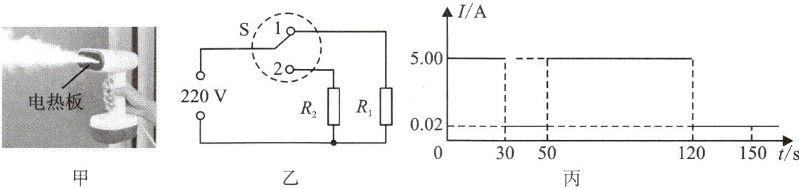 18. 小红用如图甲所示的手持挂烫机帮家人熨烫衣物,挂烫机内的水被加热汽化后喷出。图乙为挂烫机的等效电路,$R_1$为加热电阻,$R_2$为限流电阻,S为自动温控开关。将挂烫机接入电路,S在位置“1”,前端电热板被加热,电路中的电流为$5.0 A$;当温度升到$130\ ° C$时,S切换到位置“2”,挂烫机处于待机状态,电路中的电流为$0.02 A$;当温度降到$100\ ° C$时,S又回到位置“1”。