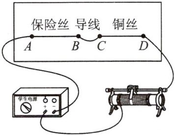 1. 长短、粗细均相同的保险丝和铜丝,分别接到线路板上 A、B 间和 C、D 间,如图所示。移动滑动变阻器的滑片,发现保险丝熔断而铜丝完好。下列说法错误的是(