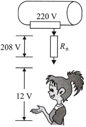 (3)经过防电墙处理后,人体承受的最大电压为$12\ V$,且“水电阻”和人体串联,最大电流为$5\ mA=0.005\ A$,由图可知“水电阻”两端的电压$U_ 水=208\ V$,根据欧姆定律可得“水电阻”的最小阻值:$R_ 水min=\frac{U_ 水}{I_ max}=\frac{208\ V}{0.005\ A}=4.16×10^4\ \Omega$。