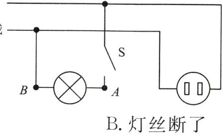 9. 如图,在家庭电路中,闭合开关后灯泡不亮。用测电笔检测插座的两孔,发现只有插入右孔时氖管才发光。用测电笔检测$A$点,氖管发光;检测$B$点,氖管不发光。发生这一现象的原因可能是(