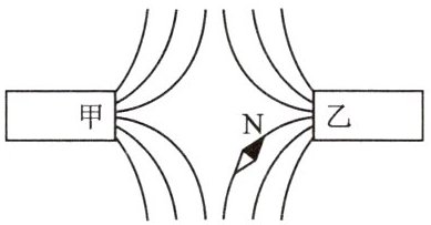 5. 甲、乙为不同条形磁铁的两个磁极,弧线是部分未标方向的磁感线,根据图中小磁针静止时的指向判断甲、乙的磁极,下列描述正确的是(