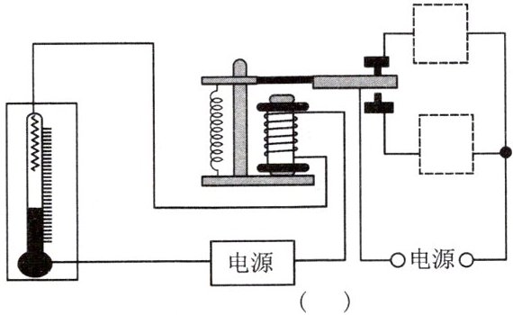6. 某温度自动报警器的原理图如图所示。电磁铁上端为$N$极,在水银温度计中封入一段金属丝,当温度低于设定温度时,安全指示灯常亮;当温度达到设定温度时,安全指示灯熄灭,电铃发出报警信号。请在括号中标出电源的极性(用“$+$”或“$-$”表示),并在虚线框内填入电铃(�铃)和指示灯的电路元件符号。