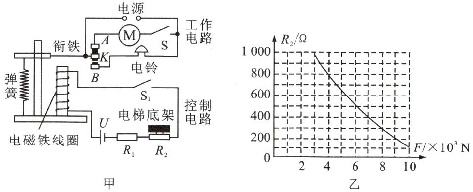 8. 电梯为居民出入带来了很大的便利。小明查阅资料了解到:出于安全考虑,电梯都设置了超载自动报警系统,其工作原理如图甲所示。电路由工作电路和控制电路组成:在工作电路中,当电梯没有超载时,动触点$K$与静触点$A$接触,闭合开关$S$,电动机正常工作;当电梯超载时,动触点$K$与静触点$B$接触,电铃发出报警铃声,即使闭合开关$S$,电动机也不工作。在控制电路中,已知电源电压$U = 6\ V$,保护电阻$R_1 = 100\ \Omega$,电阻式压力传感器(压敏电阻)$R_2$的阻值随压力$F$大小变化的图像如图乙所示,电梯自重和电磁铁线圈的阻值都忽略不计。