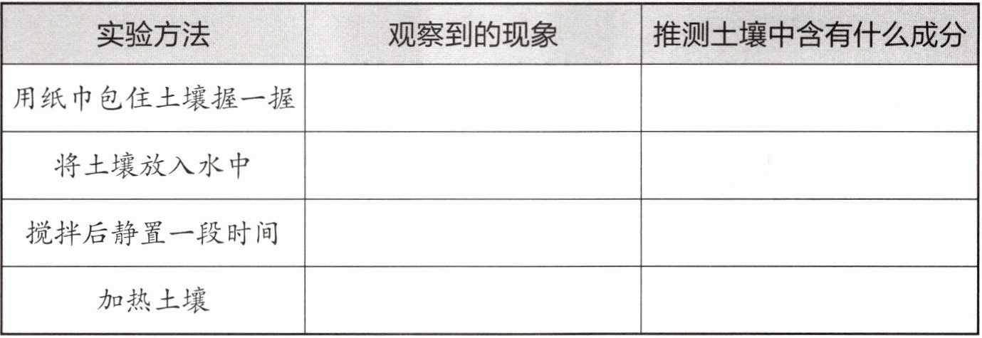 2. 把土壤放入水中,看到有气泡冒出,搅拌后静置,看到水面上漂浮着枯枝碎叶等,水底沉淀着泥沙颗粒,大颗粒的在下,小颗粒的在上。通过这个实验可以发现:土壤里有(