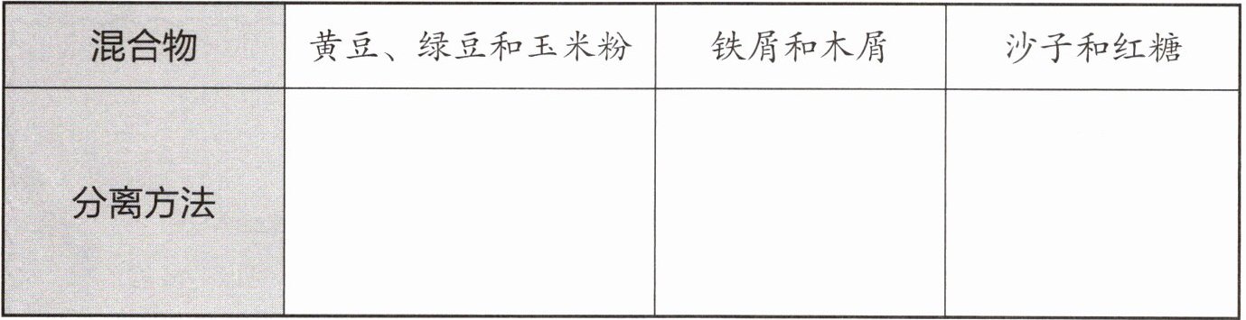 二、用网格大小不同的筛子分别筛出黄豆和玉米粉 用磁铁吸出铁屑 把沙子和红糖放入水中,沉淀后倒出红糖水剩下沙子,然后蒸发红糖水得到红糖