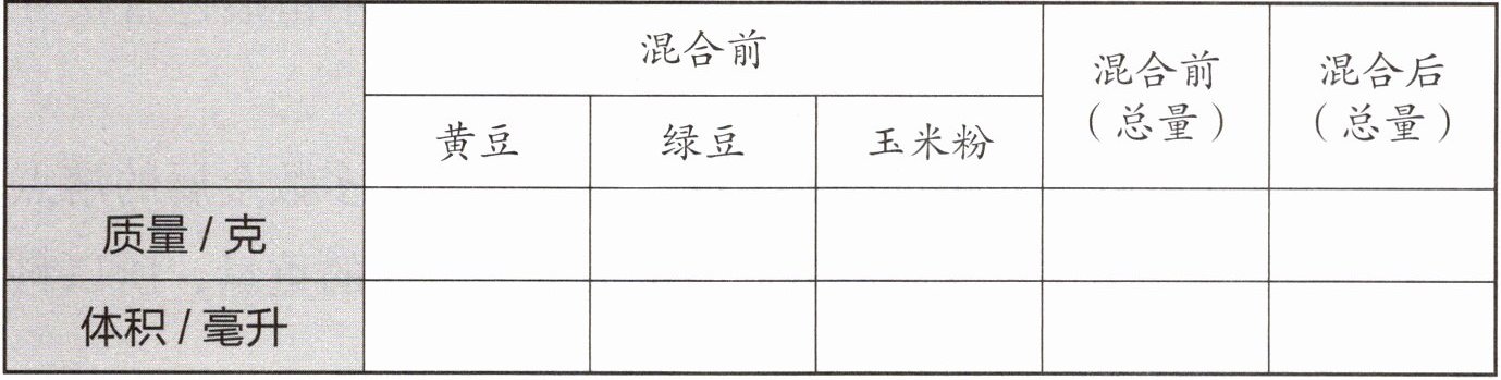 一、记录实际测得的数据 不变 有变化(变小) 因为黄豆、绿豆之间有一定的空隙,玉米粉会占据这些空隙,所以它们混合后总体积会有变化(变小)。