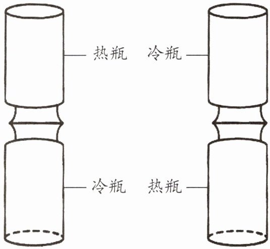 按照教材第61—62页的方法操作实验,抽掉冷热瓶之间的玻璃片,观察烟的流动。用红色箭头标出热空气的流动方向,用蓝色箭头标出冷空气的流动方向。猜一猜冷热空气为什么这样流动。