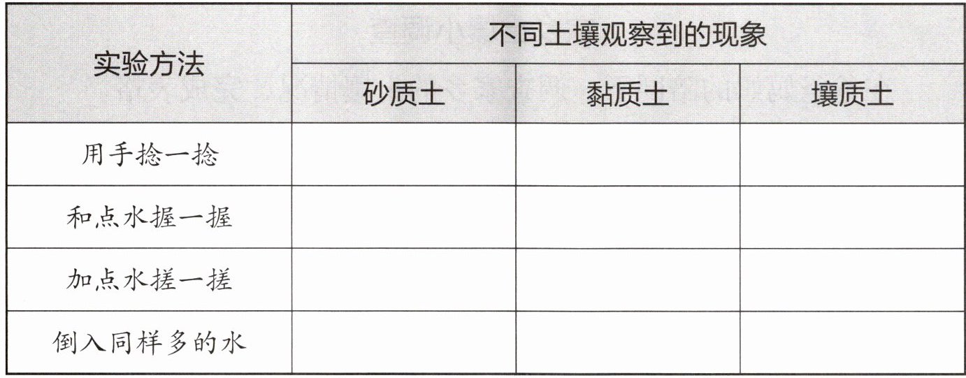 用手捻一捻:颗粒粗糙、较硬;颗粒细腻、黏滑;颗粒粗细适中、不太硬也不太软。和点水握一握:容易散开,不成团;能握成紧密的团,不易散开;能握成团,但容易散开。加点水搓一搓:很难搓成条,即使搓成条也容易折断;能搓成较长较细的条,不易折断;能搓成条,但容易折断。倒入同样多的水:渗水最快,水面下降快;渗水最慢,水面下降慢;渗水速度适中,水面下降速度适中。