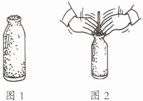 首先,选一个瓶口比较窄的瓶子,装满米(如图 1)。接着,将一根筷子深深插入米中,同时把筷子周围的米用力压一压(如图 2)。
