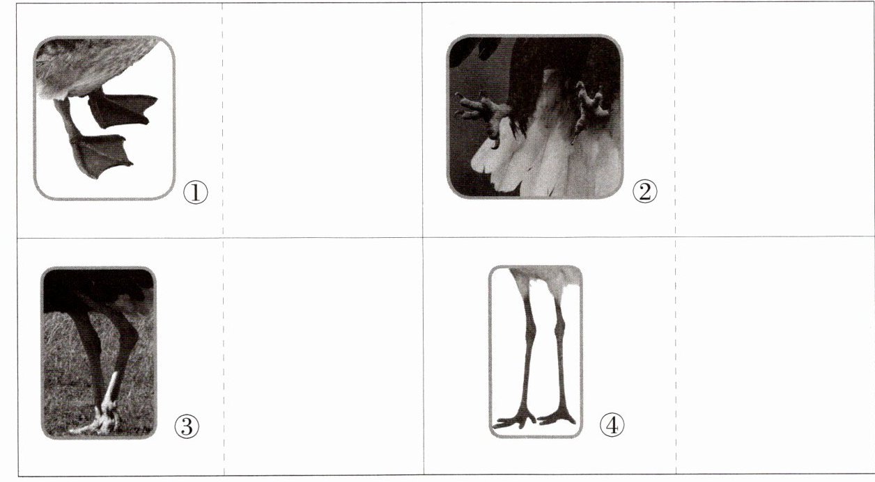 2.图①鸟的足适合游水;图②鸟的足属于肉食性猛禽,适合捕食小动物,大多在高山、草原生活;图③鸟的足粗壮有力,适合奔跑,常在沙漠、荒原中生存;图④鸟的足细长,适合涉水,一般在水边生活。