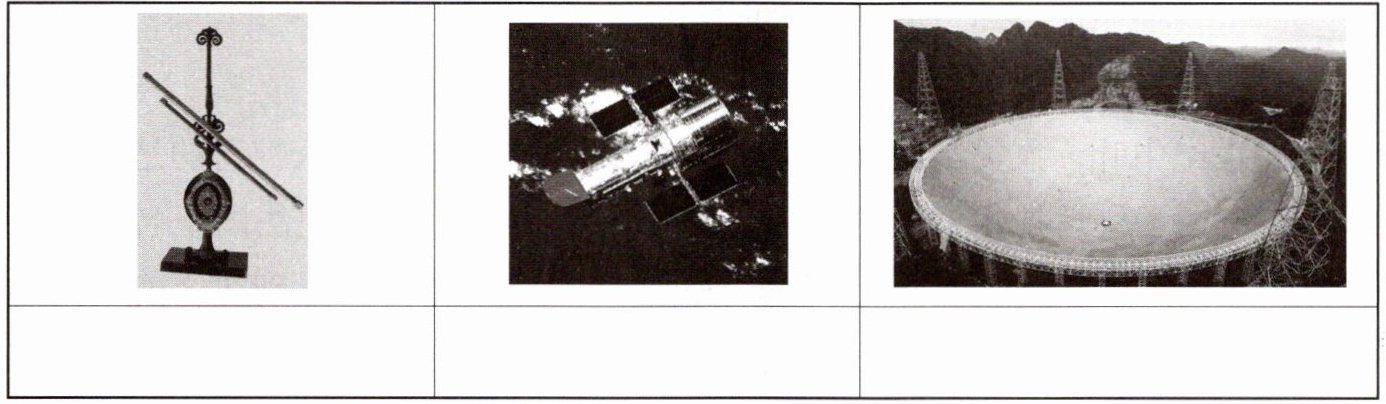 从左到右依次为:伽利略望远镜(或称折射式望远镜,图中为早期望远镜结构形式);哈勃空间望远镜;中国天眼(FAST,500米口径球面射电望远镜)。