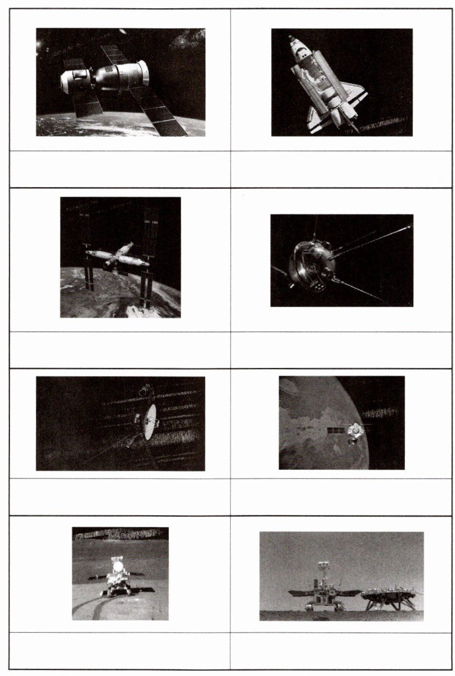 第一行左侧:天宫空间站(或类似的空间实验室型航天器,根据常见知识判断)