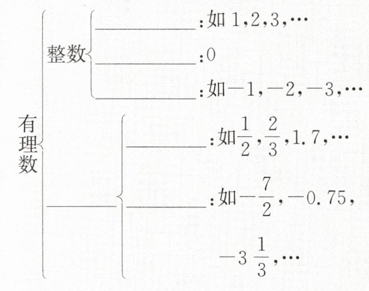 有理数$\begin{cases} 整数:\begin{cases} $_________$:如1,2,3,\cdots\\ $_________$:0\\ $_________$:如-1,-2,-3,\cdots \end{cases}\\ 分数:\begin{cases} $_________$:如\frac{1}{2},\frac{2}{3},1.7,\cdots\\ $_________$:如-\frac{7}{2},-0.75,-3\frac{1}{3},\cdots \end{cases} \end{cases}$
