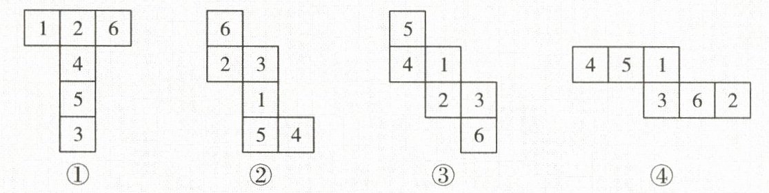 14. 一个正方体的六个面分别标有数字1~6,且相对面之和都为7,将其展开后可能会得到下列图形中的