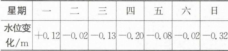 C 解析对于①,(+0.12)+(−0.02)+(−0.13)+(−0.20)+(−0.08)+(−0.02)+(−0.32)=−0.65(m),故与上周日相比,本周日水位下降了0.65m。对于②,星期一较上周日水位上升了0.12−0.02=0.1m,星期二较上周日水位上升了0.12−0.02=0.1m,星期三较上周日水位下降了0.13−0.1=0.03m,星期四较上周日水位下降了0.03+0.20=0.23m,星期五较上周日水位下降了0.23+0.08=0.31m,星期六较上周日水位下降了0.31+0.02=0.33m,星期日较上周日水位下降了0.33+0.32=0.65m,故本周内星期一的水位最高。对于③,0.20+0.08+0.02=0.30(m),故本周内星期六的水位比星期三下降了0.30m。故选C。