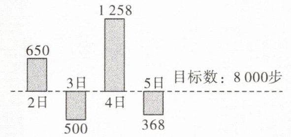 7.如图,小李在某运动APP中,设定了每天的步数目标为8000步,该APP用目标线上方或下方的柱状图表示每天超过或少于目标数的步数。如3日,小李少于目标数的步数500步,则从2日到5日这四天中小李一共走的步数为(