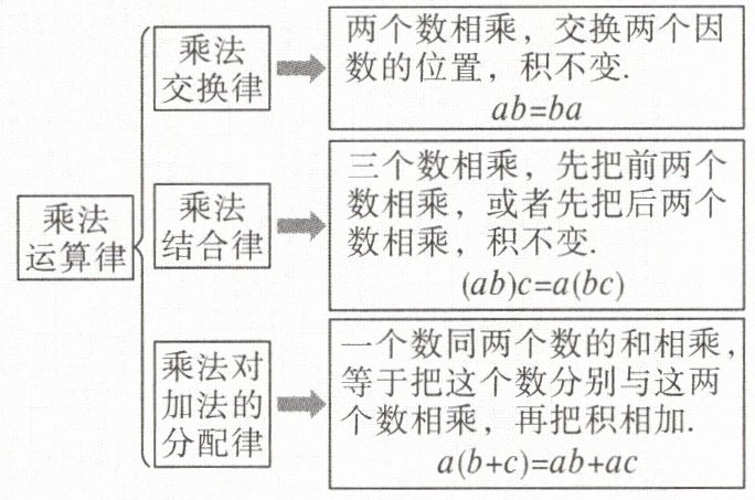 乘法结合律 $\begin{cases} 三个数相乘,先把前两个\\ 数相乘,或者先把后两个\\ 数相乘,积不变.\\ (ab)c = a(bc)\end{cases}$