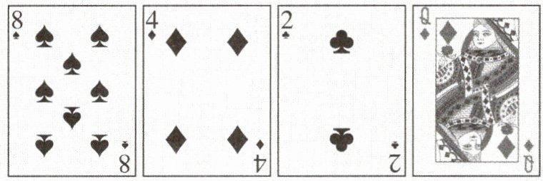 7. 嘉嘉和琪琪在玩“24 点”游戏,游戏规则是从一副扑克牌(去掉大、小王)中任意抽取 4 张,把牌面上的数运用你所学过的运算(可以使用括号)得出 24。每张牌必须使用一次且只能用一次。嘉嘉抽到的 4 张牌如下(Q 代表 12),请帮他写出一个计算结果为 24 的算式