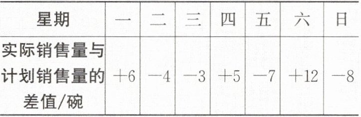 8. 某面店计划每天卖出 200 碗面,每天的实际销售量与计划相比有出入,某星期的销售情况(超出计划销售量的部分记为正,不足计划销售量的部分记为负)如表所示: