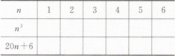 (1)中求出的$n^{3}$,$20n + 6$的值,观察两个代数式的变化规律,可以发现,随着$n$的值逐渐变大,$n^{3}$比$20n + 6$的值增加得快,且当$n = 5$时,$n^{3}$开始大于$20n + 6$,故$n^{3}$的值会首先超过$600$。