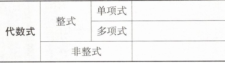 解填表如下。|代数式|单项式|整式|多项式|非整式| | ---- | ---- | ---- | ---- | ---- | | | 3a,5,-xy | | $\frac{a - b}{2}$,a + b,$a^2 - 2ab + 1$ | $\frac{4}{a}$ |