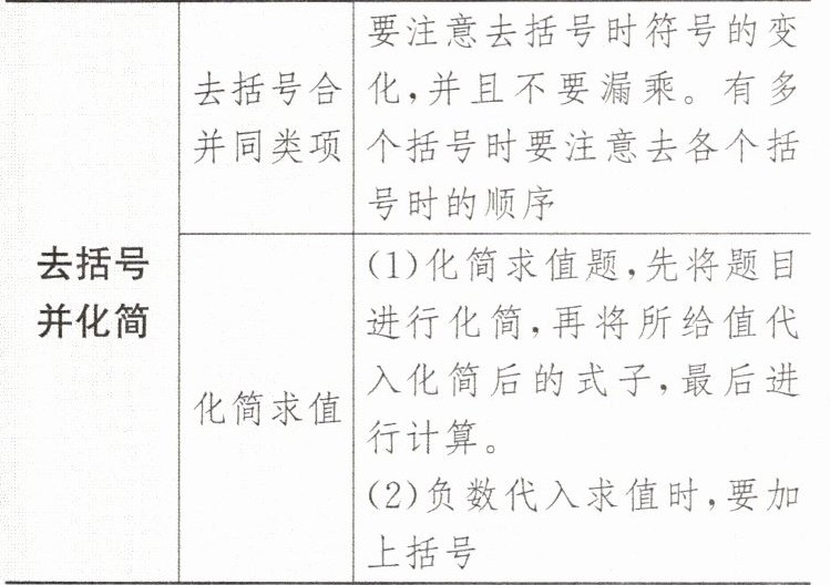 要注意去括号时符号的变化,并且不要漏乘。有多个括号时要注意去各个括号时的顺序