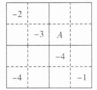 7. 下图是一个宫格图,图中实线划分的区域是一个宫,共有4个宫,每一宫又被虚线分为四个小格。根据图中已经给的提示数字,在其他的空格上填入数字-1,-2,-3,-4,使-1,-2,-3,-4每个数字在每一行、每一列和每一宫中都只出现一次,则图中点$A$位置所填的数字为