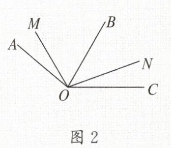 (2)如图2,若∠AOC=140°,∠AOM=∠NOC=$\frac{1}{4}$∠AOB,且∠BOM:∠BON=3:2,求∠MON的度数。
