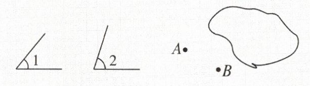 7.小亮的一张地图上有$A$,$B$,$C$三个城市,但地图上的$C$城市被墨迹污染了(如图),但知道$\angle BAC = \angle 1$,$\angle ABC = \angle 2$,请你用尺规作图法帮他在图中确定$C$城市的具体位置(尺规作图,保留作图痕迹,不写作法)。