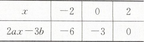 8.$x = 0$解析由题意得当$x = 0$时,$2ax - 3b = -3$,即$-3b = -3$,解得$b = 1$。由题意得当$x = 2$时,$2ax - 3b = 0$,即$4a - 3 = 0$,解得$a = \frac{3}{4}$。把$a = \frac{3}{4}$,$b = 1$代入关于$x$的方程$-\frac{ax}{3} + \frac{b}{2} = \frac{1}{2}$中得$-\frac{\frac{3}{4}x}{3} + \frac{1}{2} = \frac{1}{2}$,$-\frac{\frac{3}{4}x}{3} = 0$,所以$-\frac{3}{4}x = 0$,解得$x = 0$。