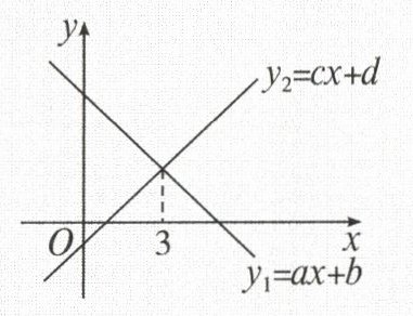 8. 一次函数$y_{1}=ax + b(a\neq0)$与$y_{2}=cx + d(c\neq0)$的图象如图所示,则下列结论:①$ad + bc>0$;②$3(a - c)=d - b$;③$x$的值每增加$1$,$y_{2}-y_{1}$的值增加$b - d$。其中正确的是(