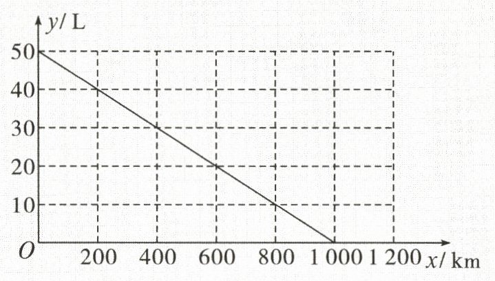 14. (10 分)有一种节能型轿车的储气箱最多可装燃气$50\mathrm{L}$,加满燃气后,储气箱中的剩余燃气量$y$(单位:$\mathrm{L}$)与轿车行驶路程$x$(单位:$\mathrm{km}$)之间的关系如图所示,根据图象回答下列问题: