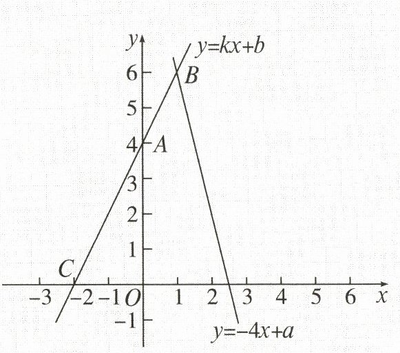 (2)若点$B$的横坐标是 1,求点$B$的坐标,并直接写出关于$x$,$y$的方程组$\begin{cases}y = kx + b, \\ y = -4x + a\end{cases}$的解;