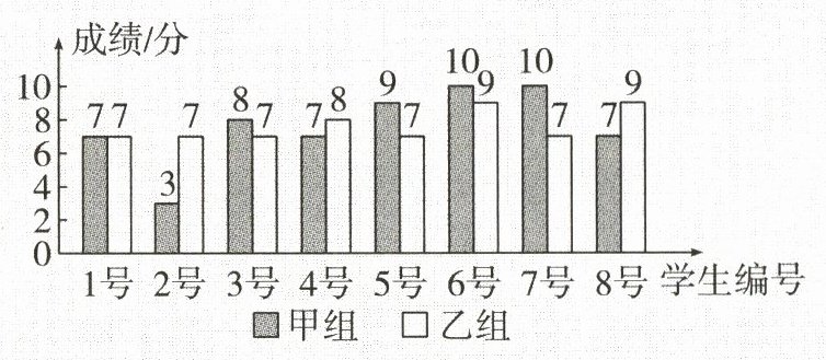 数据整理:小夏将本班甲、乙两组同学(每组8人)初赛的成绩整理成如右的统计图。