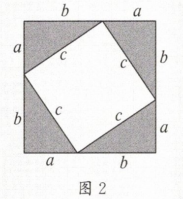 操作:剪四个与图1完全相同的直角三角形,然后将它们拼成如图2所示的图形。